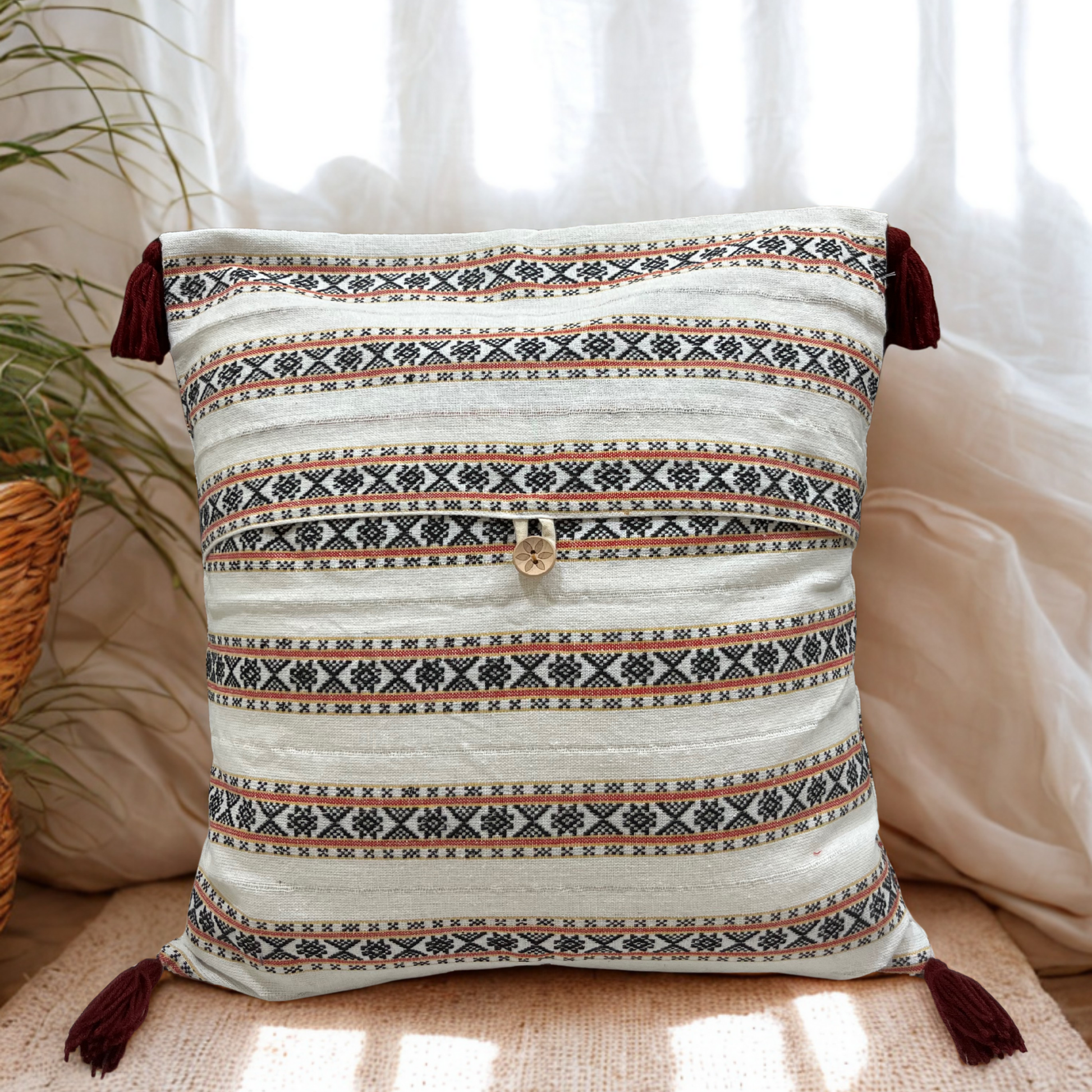 Desert Song is a quiet ode to tradition — a cushion that sings in soft stripes and earthy elegance. With sand-toned cotton as its canvas, it features intricate tribal-inspired lines in muted black, rust, and olive — all accented by hand-tied maroon tassels adorned with wooden beads at each corner.